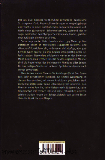 In den weiteren Kapiteln beschreibt Bud Spencer dann chronologisch sein Leben, von den Anfängen in Neapel über die Flucht nach Rom und erste Erfolge im Schwimmen, bis hin zu seinen zwei Aufenthalten in Südamerika und seiner beeindruckenden Schwimmkarriere mit den zwei Olympiateilnahmen als Höhepunkt. Und dann beschreibt Bud Spencer natürlich auch wie er zum Film gekommen ist und anschließend seine unglaubliche Schauspielkarriere seinen Lauf nahm. Das alles garniert Bud Spencer mit der ein oder anderen philosophischen Einlage. Diese sind zwar teilweise auch etwas skurril, aber davon abgesehen ist diese Biografie doch sehr gelungen und absolut lesenswert. Zum Abschluss gibt es dann noch einmal die komplette Filmografie Spencers, anhand derer Bud eigentlich gesehen haben sollte, dass er eben nicht die über 100 Filme gedreht hat, die er in seinen Interviews immer erwähnt. Da wird dann doch deutlich, dass er beim Schreiben seiner Memoiren Hilfe hatte, aber das ist natürlich sein gutes Recht. |