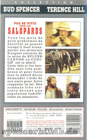 | Auch das Cover dieser Videokassette bringt mal wieder einiges durcheinander, so stammt das große Frontmotiv aus dem Film "Eine Faust geht nach Westen" und zwei der Screenshots auf der Rückseite aus "Sie verkaufen den Tod". Lediglich der mittlere Screenshot dürfte wirklich aus "Die letzte Rechnung zahlst Du selbst" stammen. |