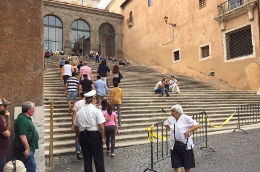 Von 10.00 Uhr bis 19.00 Uhr konnten sich hier die Menschen in aller Ruhe von Bud verabschieden. Da ich keinen früheren Flug buchen konnte, kam ich erst gegen 16.00 Uhr an Ort und Stelle an. Zu diesem Zeitpunkt waren sämtliche Trauerreden gehalten und die Presse hatte alle Berichte und Fotos im Kasten und sich schon lange wieder aus dem Staub gemacht. Die Schlange am Eingang zum Saal Protomoteca war auf ein paar Leute zusammengeschrumpft, in Tranchen von 15 Leuten wurden die Besucher in den Saal gelassen. So musste ich keine zwei Minuten warten, bis ich die Treppen hoch zum Saal erklimmen konnte.