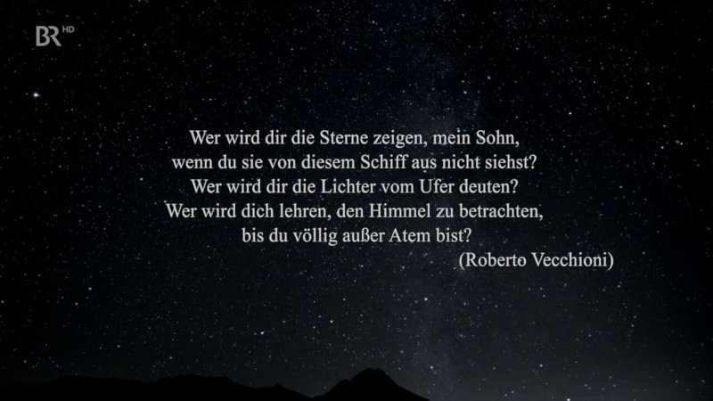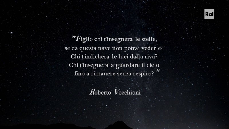 Wer wird Dir die Sterne zeigen, mein Sohn, wenn Du sie von diesem Schiff aus nicht siehst? Wer wird Dir die Lichter vom Ufer deuten? Wer wird Dich belehren, den Himmel zu betrachten, bis Du völlig außer Atem bist? Figlio chi t'insegnerà le stelle, se da questa nave non potrai vederle? Chi t'indicherà le luci dalla riva? Chi t'insegnerà a guardare il cielo fino a rimanere senza respiro?