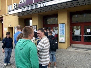 Eröffnet wurde die Retrospektive plangemäß am Freitag, 19. August, um 18 Uhr. Los ging es mit einer Autogrammstunde, die mit Bud Spencers Erscheinen gegen 18.45 Uhr in entspannten und geregelten Bahnen abgwickelt wurde. Geduldig arbeitete er sich durch die lange Schlange an Fans, bis auch der letzte der Anstehenden mit einem kurzen "Bud"-Schriftzug versorgt von dannen ziehen konnte. Entgegen den vorhergegangenen Ankündigen hatten hierzu auch Fans ohne Eintrittskarte zur nachfolgenden Programm-Veranstaltung Zutritt. Wie bei den Signier-Terminen zuvor konnte auch diesmal nur die im Verlag Schwarzkopf & Schwarzkopf erschienene Autobiographie zur Signatur mitgebracht werden - diesmal allerdings nicht nur in Buchform, sondern erstmals auch als CD-Hörbuchedition, die an diesem Abend den Fans erstmals öffentlich vorgestellt wurde. Im Foyer des Kinos waren zwei Stände des Verlages aufgebaut, an denen die besagten Produkte käuflich erworben werden konnten.