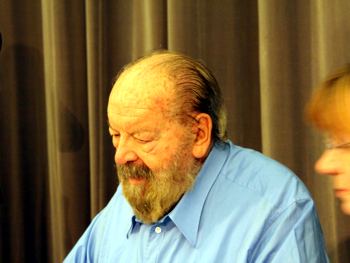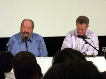 Im Unterschied zu den bisher bekannten Interview-Auftritten, bei denen Spencer sich auf die schier gebetsmühlenartige Wiederholung der immergleichen Antwort-Versatzstücke beschränkte, förderte das nun einsetzende Gespräch zwischen ihm und seinem Verleger diesmal durchaus neue Erkenntnisse zu Tage und gestaltete sich erfreulicherweise in einer unerwarteten und bisher unbekannten Flüssigkeit. Zwar durften einige der bekannten Floskeln auch diesmal nicht fehlen, doch überraschten Spencers Witz, Redefreude und - vor allem - kecke Spontaneität, die in seinen Antworten diesmal fast immer genau auf die Frage abzielten und somit einen runden, in sich schlüssigen Unterhaltungsbogen spannten, dem sich auch ohne Vorkenntnisse sehr gut folgen ließ. Die Überraschungs-Information des Abends war sicherlich der Umstand, dass Bud bereits an einem zweiten Buch arbeitet, das voraussichtlich im März nächsten Jahres erscheinen soll und zu dessen Vorstellung er dann nach Berlin zurückzukommen versprach. Über den Inhalt dieses Buches wurde leider nichts Näheres verlautet. Nachdem sich Oliver Schwarzkopf nach und nach durch seinen Fragekatalog durchgearbeitet hatte und dazu einige begeistert aufgenommene kurze Filmclips gezeigt worden waren, erhielten auch die Fans Gelegenheit zu Fragen und spontanen Danksagungen, für die sich ihr gut aufgelegtes Idol lächelnd bedankte. Zwei junge Männer eilten dabei nach vorne und baten Spencer zu Tätowierungszwecken so lange vehemend um eine Unterschrift auf ihren Oberkörper, bis dieser - etwas skeptisch angesichts dieser Gunstbezeigung - nachgab und seinen Namenschriftzug dort verewigte.