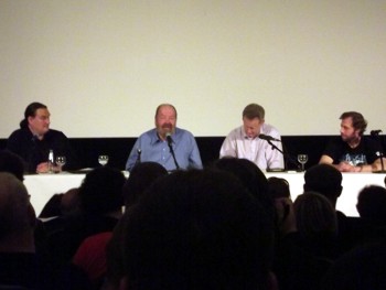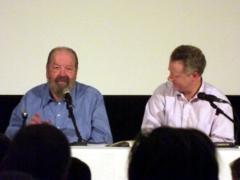 Mit etwas Verspätung begann im Anschluß an den öffentlichen Part der Veranstaltung der für 19.30 Uhr angesetzte Programm-Teil, der gegen den Erwerb einer Eintrittskarte zum Preis von 12 EUR besucht werden konnte. Die circa 500 Plätze des Babylon-Kinos waren restlos ausverkauft, als Verleger Oliver Schwarzkopf das Mikrofon ergriff und Bud Spencer noch einmal offiziell sehr herzlich begrüßte. Das Publikum kommentierte dies mit einem donnernd-tosenden, minutenlangen Applaus und spontanen Standing Ovations, die erst nach den besänftigen Worten des selbst ganz ergriffenen Verlegers langsam leise abebbten. Bud erhob sich dazu sichtlich gerührt und begrüßte die Fans auf Deutsch und Englisch. Mit ihm waren diesmal auch ein Großteil seiner Familie angereist: In der ersten Reihe hatten Ehefrau Maria Amato, Tochter Diamante sowie ein Enkelsohn und einige weitere Verwandte Platz genommen, die den frenetischen Fan-Zuspruch freudig zur Kenntnis nahmen. Auf dem Podium selbst saß neben Bud und Herrn Schwarzkopf noch der deutsche Schauspieler Oliver Korittke, der Spencers Autobiographie für die Hörbuch-Edition eingelesen hatte und im Laufe des Abends auch noch eine Kostprobe daraus zum Besten gab. Viel wichtiger als er war für den gelungenen Ablauf des Abends allerdings die Anwesenheit des diesmal hervorragenden Simultan-Übersetzers, der - neben Bud sitzend - dafür sorgte, dass sich das folgende Gespräch nicht nur sehr unterhaltsam, sondern auch sehr informativ gestaltete: Selbst längere Ausführungen wurden von ihm in grammatikalisch einwandfreies Deutsch überführt, so dass das Zuhören große Freude bereitete.
