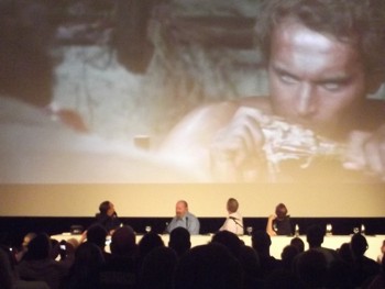 Obgleich nur ein Bruchteil der Publikumsfragen beantwortet werden konnte, sah sich Oliver Schwarzkopf gegen 21 Uhr dazu gezwungen, die Fragerunde zu schließen, da kurz darauf die Filmvorführung von "Die rechte und die linke Hand des Teufels" auf dem Programm stand. Mit nochmals donnerndem Jubel wurden Bud Spencer und seine Familie verabschiedet und unter rhythmischem Applaus und einmal mehr stehenden Ovationen aus dem Saal begleitet. Nach kurzer Pause begann dann der Film - tatsächlich nicht von DVD per Beamer, sondern im Original-Kinoformat gescreent. Die Farben waren zwar etwas gelbstichig, doch das erhöhte nur das nostalgische Retro-Feeling im gut gefüllten Kino-Saal. Und einmal mehr zeigte sich, was für ein grandioser, in seiner Komik genau durchdachter, im Grunde zeitloser Film Bud Spencer und seinen Mitstreitern hier gelungen ist: Obgleich wohl jeder im Kino den Westernklassiker schon gekannt haben dürfte, lachte die Menge noch genauso begeistert wie damals vor über vierzig Jahren zu Premierenzeiten. Nach dem Filmende klang der schöne Bud-Spencer-Abend dann nach 23 Uhr in privater Fangesprächsrunde aus.