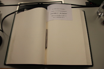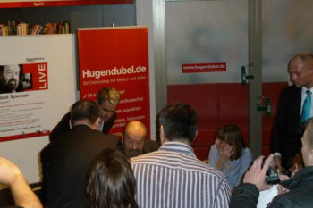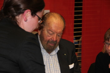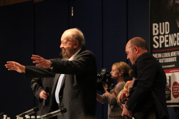 Nach der Umbenennungzeremonie im Freibad wurde dem alten Herrn eine kleine Pause gegönnt. Seinen nächsten Termin hatte erst wieder um 17 Uhr. Um diese Zeit begrüsste Bud seine Fans im CongressCentrum Stadtgarten zur obligatorischen Signierstunde, bei der er sich erneut nach Kräften bemühte alle Autogrammwünsche zu erfüllen. |