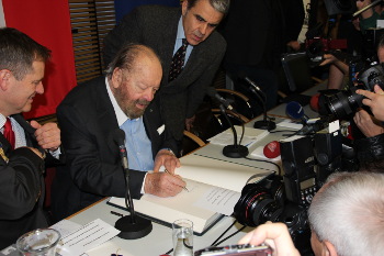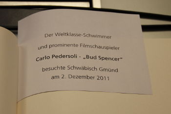 Nach seinen Terminen in München und Stuttgart ging es für Bud Spencer nach Schwäbisch Gmünd, wo er über den ganzen Tag verteilt gleich vier Termine hatte. Der Tag begann mit einer Pressekonferenz auf der Bud Spencer sich schließlich in das Goldene Buch der Stadt eintrug. Diese Ehre hatte er sich dadurch verdient, dass er vor über 50 Jahren mal in Schimmbad der Stadt an einem Schwimmwettbewerb teilgenommen hat. Ketzer könnten nun vielleicht fragen, ob sich auch alle anderen Teilnehmer dieses Wettbewerbs in dem Buch verewigen durften, aber es wurde ja schließlich nicht aus allen ein berühmter Filmschauspieler. Bud Spencer jedenfalls freute sich über die Ehre und der Oberbürgermeister freute sich über den prominenten Besuch und sicher auch über die viele Presse, die von dem Ereignis berichtete.