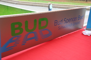 Vom Rathaus aus zog der ganze Tross dann weiter in das Gmünder Freibad, wo damals der legendäre Schwimmwettkampf statt gefunden hatte. Auf dem Freibadsgelände wurde Bud Spencer natürlich wieder von zahlreichen Fans und Medienvertretern erwartet, was diesen sichtlich erfreute. So sprach er dann einige Worte zu den Fans, nahm Geschenke des örtlichen Schwimmverbandes entgegen und ließ dann tapfer die Umbennenungszeremonie über sich ergehen. Am Ende hatte das Gmünder Freibad dann einen neuen Namen. Es heißt nun ganz offiziell "Bud Spencer Bad".