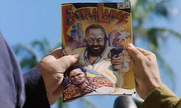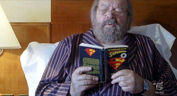 Nach "Zwei außer Rand und Band", "Der Supercop", "Zwei bärenstarke Typen" und "Zwei Supertypen in Miami" hat Comic-Held Superman hier noch einen fünften Auftritt. Es handelt sich hierbei allerdings nicht wirklich um ein Comic, denn in der Folge "Chi ha ammazzato lo chef?" liest Bud im Bett den Roman "The Death and Life of Superman" aus dem Jahr 1993. Interessanterweise liest er dabei nicht die weitverbreitete US-Ausgabe des Romans, sondern die indonesische Auflage. |