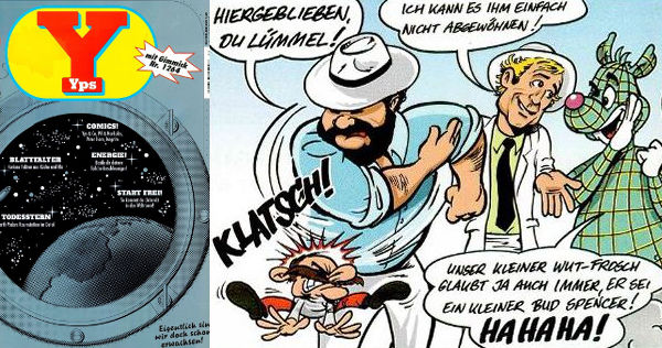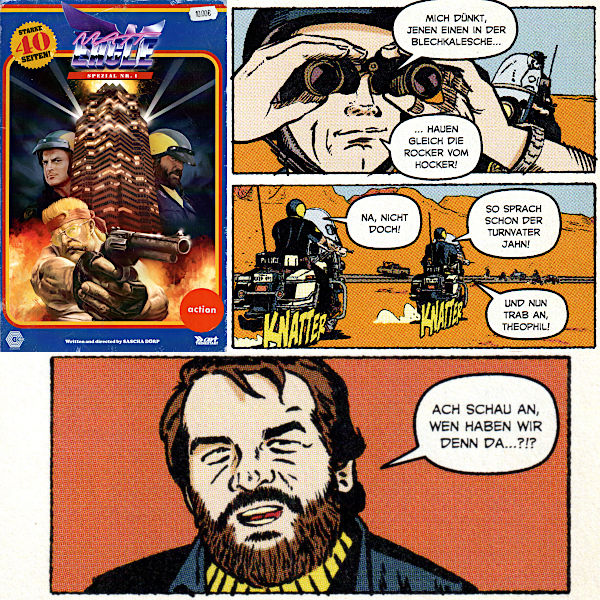 Der Comicheld Matt Eagle des deutschen Zeichners und Texters Sascha Dörp bekommt in seinem Abenteuer "6 Fäuste lassen's krachen" schlagkräftige Unterstützung von Bud Spencer und Terence Hill alias Wilbur Walsh und Matt Kirby, ihren Charakteren aus "Zwei außer Rand und Band". Auch hier sind sie als Motorradpolizisten auf Streife als sie auf Matt Eagle treffen, der gerade einen Gangsterboss in ein Gefängnis überführen möchte und dabei in den Hinterhalt einer Rockerbande gerät. Gemeinsam machen sie aus der Bande Kleinholz. Der Gangsterboss und die Rockerbande sind dabei übrigens dem 80er-Jahre-Actionreißer "Death Wish 3" entliehen. |