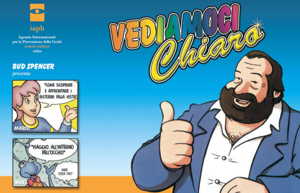 Für einen guten Zweck ließ sich Bud Spencer schließlich im Jahr 2001 auch noch einmal zeichnen. Für die italienische Abteilung der Internationalen Agentur für die Vorbeugung von Blindheit (IAPB) wurde der gezeichnete Bud Spencer zum Protagonisten in dem Comic Vediamoci chiaro (auf Deutsch sinngemäß: "Sieh klar"). In dem Comic begleitet Bud den Leser auf eine Reise ins Innere des Auges und macht so darauf aufmerksam, wie wichtig es ist, seine Augen nicht zu vernachlässigen. Der komplette Comic lässt sich auf der Seite der IAPB herunterladen. Zum Herunterladen bitte das Bild anklicken. |