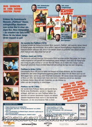 "Sie nannten ihn Plattfuss" ist hier neben der deutschen Kinofassung auch erstmals in der italienischen Originalfassung und damit ungekürzt veröffentlicht worden. Auch von "Plattfuss in Afrika" gibt es in dieser Box eine neue Langfassung. Diese ist zwar ca. 12 Minuten länger als die ebenfalls vorhandene deutsche Kinofassung, ist aber gegenüber der italienischen Originalfassung noch immer gekürzt. Die Langfassung von "Plattfuss in Afrika" enthält nicht synchronisierte Szenen mit italienischen Originalton. Diese Szenen sind deutsch untertitelt. Von "Plattfuss räumt auf" und "Plattfuss am Nil" gibt es in dieser Box keine neuen Fassungen, aber das ist auch nicht nötig, denn diese beiden Filme waren in Deutschland schon immer ungekürzt.