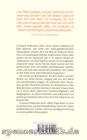 Bud Spencers älteste Tochter Cristiana Pedersoli erinnert sich an ihren Vater und schildert verschiedene Episoden aus dem Leben des großen Schauspielers. Dazu gibt es vier Bildteile mit zum Tein bisher unveröffentlichten Bildern aus dem Familienarchiv der Pedersolis. In kurzen Kapiteln kommen auch Buds Frau Maria, sowie Cristianas Geschwister Giuseppe und Diamante zu Wort.