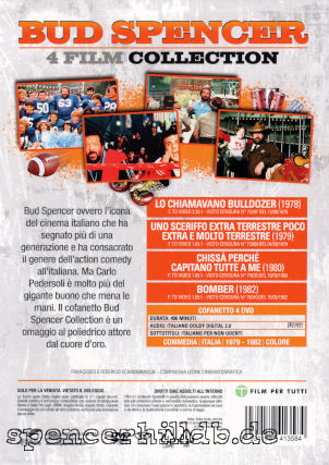 Diese 4-Film-Collection enthält die Filme "Sie nannten ihn Mücke", "Der Bomber", "Der Große mit seinem außerirdischen Kleinen" und "Buddy haut den Lukas". Alle Filme wurden in Italien so auch schon wiederholt veröffentlicht. |