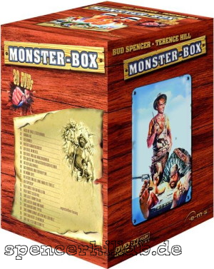 Die Box enthält insgesamt 20 Filme mit Bud Spencer und Terence Hill, wovon sie allerdings in nur 11 dieser 20 Filme gemeinsam auftreten. Im Gegensatz zur Erstauflage der Monster-Box kommt diese Box nicht mehr als Schatztruhe daher. Stattdessen gibt es nun einen Schuber, in dem die DVDs stehen. Auch wurde bei der Neuauflage leider auf das lesenswerte Booklet verzichtet, dass der Erstauflage noch beilag. Bei den Filmen hat sich allerdings nichts geändert, so ist auch hier die remasterte und ungeschnittere Version von Zwei Asse trumpfen auf enthalten. Die Filme Halleluja... Amigo, Sie verkaufen den Tod und Django und die Bande der Gehenkten sind in dieser Box weiterhin als geschnittene Comedy-Versionen mit ihren entsprechenden Titeln "Der Dicke in Mexico", "Der Dicke und das Warzenschwein" und "Joe, der Galgenvogel" enthalten. |