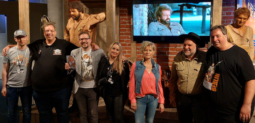 Group picture with fans in front of Bud Spencer and Terence Hill figures