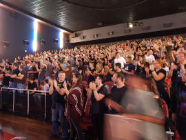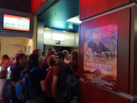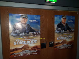Vergleichsweise unspektakulär ging Terence Hills "Mein Name ist Somebody"-Kinotour im "UCI Kinowelt Millenium City" in Wien zu Ende. Bis auf das Aufhängen von einigen Somebody-Postern über das ganze Kino verstreut, hatten sich die UCI-Kinobetreiber nichts weiter einfallen lassen (z.B. im Vergleich zum Vortag im Hollywood Megaplex in Pasching, wo es eigene Getränke zum Film gab oder im CineStar in Frankfurt, wo die Kinomitarbeiter eigene Somebody-T-Shirts trugen). Die Fans waren gut gelaunt, viele trugen Spencerhill-spezifische T-Shirts und eine größere Gruppe kam beispielsweise im "I love K1"-Look, bekannt aus Zwei bärenstarke Typen. Da das UCI-Personal aber praktisch nichts unternahm, um die Fans in irgendeiner Form mit Informationen zu versorgen, entstand ein wenig Chaos. Fans vermischten sich mit normalen Kinogängern, die nicht wussten was los ist, es bildete sich eine Menschentraube vor dem "iSens"-Kinosaal und ein Spalier beim Saaleingang, da Fans vermuteten, dass Terence hier den Saal betreten würde (was schließlich nicht der Fall war). Erst sehr spät kam die Aufforderung einer Kinomitarbeiterin, dass sich alle Kinobesucher auf ihre Sitze begeben müssten, ansonsten würde Terence nicht kommen. Der große "iSens"-Saal war sehr gut gefüllt, der eine oder andere Platz blieb allerdings frei. Auf die Leinwand war von Beginn ein Szenenbild aus "Mein Name ist Somebody" projeziert. Schließlich betrat Marcus Zölch die Bühne und kündigte Terence als einen Menschen an, der Wiener Schnitzel liebt und mit offenen Augen durch die Stadt fährt und immer wieder sagt, wie schön er alles in Wien findet. Das kam beim Wiener Publikum verständlicherweise gut an; richtig großer Jubel brach aber natürlich aus, als Terence dann persönlich die Bühne betrat. Er hatte diesmal einen Teddybären unter dem Arm, den er während der Tour von einer Dame geschenkt bekommen hatte. Terence meinte augenzwinkernd, da er ein wenig schüchtern sei, helfe ihm der Teddybär, vor so vielen Fans/Freunden zu sprechen. Anschließend erzählte Terence, wie gewohnt auf Deutsch, wie er Bud in Almeria kennengelernt hat. Nach seiner Ansprache gab es vom Publikum Standing Ovations. Als Terence den Kinosaal wieder verließ, hielt es viele Fans nicht mehr auf ihren Sitzen und sie stürmten zu Terence am Saalausgang, um noch ein Autogramm oder ein Selfie zu ergattern. Die Wiener Fans zeigten sich also als doch eher undiszipliniert, was aber weniger ihnen anzulasten ist, sondern der UCI-Organisation. Hätte es im Vorfeld mehr Hinweise von der Kinoführung gegeben, wie sich die Fans im Kinosaal zu verhalten haben, wäre der Abend etwas weniger chaotisch verlaufen. Auch Terences Mikrofon ging anfangs nicht; hier musste Marcus aushelfen und Terence sein Mikrofon für die Ansprache geben. Alles in allem kann man sagen, dass es auf der gesamten Tour besser organisierte Termine gab, als in der "UCI Kinowelt Millenium City", Wien, aber es war dennoch eine große Freude, Terence auch in der österreichischen Hauptstadt "live und in Farbe" zu sehen.