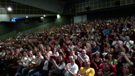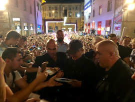 Nach einem kleinen Snack in der Hotellobby geht es gegen 19 Uhr vom Hotel aus direkt zum Corvin Kino. Hier ist ein großer Bereich für einen Roten Teppich abgesperrt. Um 19:20 Uhr erreicht Terence Hill das Kino und wird von weit mehr als Tausend Fans begeistert empfangen. Gut 40 Minuten schreibt Terence Hill auf dem Roten Teppich Autogramme, bevor er gegen 20 Uhr ins Kino geht. Auch hier warten noch hunderte Fans und da das Kino versäumt hat auch im Kino Bereiche abzusperren dauert es gut zwanzig weitere Minuten bis Terence Hill sich durch die Menge zu einem privaten Raum durchgekämpft hat. Er verschnauft zehn Minuten und betritt dann um 20:30 Uhr mit einer Verspätung von 30 Minuten den ersten Kinosaal. Begleitet wird er wieder von Synchronsprecher László Újréti und Radiomoderator Attila Várkonyi, der Terence Hill ansagt. Terence Hill erzählt auch in Ungarn seine Anekdoten darüber wie er Bud Spencer in Almería kennenlernte, hier allerdings auf Englisch. Eine Dolmetscherin übersetzt seine Worte dann ins Ungarische. Dieses Prozedur wiederholt sich anschließend noch in zwei weiteren Sälen, wobei es in Saal 2 zu einem amüsanten Vorfall kommt, denn hier klingelt während der Begrüßung das Handy von László Újréti laut vernehmlich mit dem Song Movin' Cruisin' als Klingelton. Terence Hill und das Publikum reagieren amüsiert. Nach den drei Sälen soll Terence Hills Auftritt im Kino eigentlich beendet sein, doch hat das Kino ohne Terence Hills Wissen noch Plätze in einem vierten Saal an 100 Sponsoren verkauft und denen Fotos mit Terence versprochen. Terence lässt sich überreden zumindest Gruppenfotos zu machen. So ist es schon 22 Uhr als Terence Hill das Kino wieder verlässt.