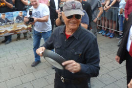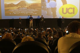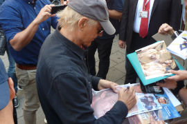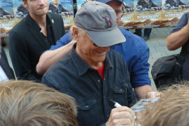 Schon am frühen Nachmittag finden sich vor dem roten Teppich der Lichtburg viele Fans ein, obwohl Terence Hill erst zwischen 17:45 Uhr und 18 Uhr erwartet wird. Als der schwarze Kleinbus mit Terence Hill an Bord sich schließlich dem Ort des Geschehens nähert, wird Terence auch hier wieder von über 1000 Fans jubelnd empfangen. Auf dem roten Teppich gibt Terence Hill nun sehr geduldig Autogramme und stellt sich auch für das ein oder andere gemeinsame Foto mit Fans zur Verfügung. Eine knappe Dreiviertelstunde nimmt Terence sich Zeit, bevor er ins Kino geht. Hier nehmen die Fans nun ihre Plätze ein. Um 18:46 Uhr betritt dann auch schon Terence Hill und lauten Applaus den Saal. In Beisein des Stars werden ein paar kurze Aufnahmen von der Himmelhund-Premiere aus dem Jahr 1973 gezeigt, eine tolle Idee der Lichtburg. Anschließend greift Terence zum Mikrofon und richtet ein paar Worte des Danks an die Fans. Auch hier erzählt er wieder die Anekdote, wie er damals in der Wüste von Almeria das erste Mal Bud Spencer traf und wie sehr er sich darüber freut, den neuen Film ebenfalls dort gedreht zu haben. Direkt im Anschluß startet dann auch schon der Film. Für Terence aber geht es direkt weiter nach Bochum, wo er schon eine gute Stunde später erwartet wird.