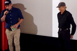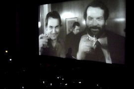 Wir waren in Vorstellung Nr. 4 um 21.10 Uhr. Mit gut 10 minütiger Verspätung ging es dann los, unter Applaus betritt zuerst Marcus Zölch den Saal, doch bevor er erklären kann, dass er nicht Terence ist (von weitem durchaus zu verwechseln) kommt Terence in flottem Schritt auf die Bühne und bekommt sofort standing Ovations. Nach einer kurzen Danksagung erzählt er seine Anekdote, wie er damals Bud in der Wüste von Almería kennen gelernt hat und wie es letztendlich dazu kam, dass er dort diesen Film gedreht hat.