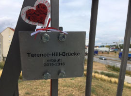 Am Nachmittag wird Terence Hill auf der Karl-Kübel-Brücke zu einer etwas seltsamen Zeremonie erwartet. Die Brücke wird in "Terence Hill-Brücke" umbenannt, wenn auch nur inoffiziell. Auch wenn die Brücke auch nach dem heutigen Tag weiter "Karl-Kübel-Brücke" heißen wird, heute ist Terence Hill zu Gast und so wird einfach mal ein neues Namensschild angebracht. Das ist zwar alles etwas seltsam, hält aber hunderte Fans nicht davon ab, dieser Zeremonie beizuwohnen und Terence Hill frenetisch an der Brücke zu begrüßen. Mit dabei sind außerdem Bürgermeister Michael Kissel, Entertainer Peter Englert, der vor ein paar Jahren die Idee zu dieser "Umbenennung" hatte und unzählige Fotografen. So wird es schnell sehr chaotisch auf der kleinen Brücke. Terence bekommt in dem Chaos von der Karl Kübel Stiftung einen kleinen Eimer mit Äpfeln geschenkt, anschließend werden auf der Brücke und an dem neuen Namensschild einige Fotos gemacht, bevor Terence Hill sich den wartenden Fans zuwendet und Autogramme schreibt. Gegen 17 Uhr ist der Spuk dann auch schon wieder vorbei und Terence Hill macht sich auf dem Weg ins Rathaus.