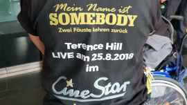 Am sechsten Tag seiner Tour stehen für Terence Hill wieder zwei Städte auf dem Programm, die allerdings sehr nah beieinander liegen. Seine ersten Termine hat er in Frankfurt/Main. Dort stehen im örtlichen CineStar ab 18:30 Uhr zwei Vorführungen seines neuen Films Mein Name ist Somebody auf dem Programm. Direkt danach geht es weiter ins benachbarte Sulzbach, wo es im Kinopolis des Main-Taunus-Zentrums drei weitere Vorstellungen gibt. |