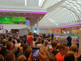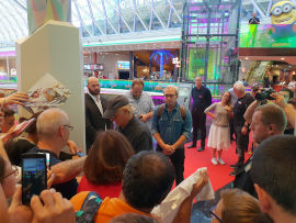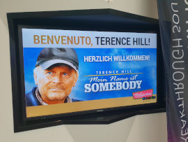 Die Plus City Pasching ist eines der größten Shoppingcenter Österreichs und beherbergt mit dem Hollywood Megaplex auch ein Kino von beeindruckender Größe. Am 07. September 2018 war Terence Hill hier zu Gast, um seinen Film Mein Name ist Somebody erstmals auch in Österreich zu präsentieren. Auf einer Vielzahl an Bildschirmen im Kino sowie im gesamten restlichen Shoppingcenter wurde auf den Film hingewiesen und Terence von den Kinobetreibern auf italienisch mit dem Schriftzug "Benvenuto, Terence Hill!" begrüßt. Und auch die Gastronomen in Pasching haben sich etwas besonderes zur Premiere einfallen lassen. Sowohl in der sich direkt im Kino befindlichen Stars-Bar, als auch in der angeschlossenen Diamonds-Bar gab es zum "Somebody"-Kinostart eine spezielle Getränkekarte mit einem alkoholfreien Cocktail mit dem Namen "Man nennt mich Nobody" (Cuba Libre), einem eigenen "Mein Name ist Somebody"-Drink (Whisky Cola) und einem vergünstigten Bier-Angebot. Bereits kurz nach 16:00 Uhr sammelten sich die ersten Fans beim Kino und wie auch schon in anderen Lichtspielhäusern in Deutschland während der "Somebody"-Premierentour, ertönten zur Freude der Fans Lieder aus den Spencerhill-Filmen aus den Lautsprechern im Kino-Foyer - beispielsweise Flying through the air, "Il mio nome è nessuno", Movin' cruisin', aber auch My name is Zulu oder Banana Joe und Bulldozer. Wie passend es ist, zu einer Hill-Premiere reine Bud-Solo-Soundtracks zu spielen, sei zwar dahingestellt. Da aber auch in Pasching wieder viele Fans (wie auch schon bei den Terminen in Deutschland) mit reinen Bud-Shirts gekommen sind, ergab sich dadurch in gewisser Weise ein stimmiges Bild. Kurz vor 17:00 Uhr begann dann eine Dame über die Lautsprecher des gesamten Shoppincenters anzukündigen, dass Terence in ca. 10 Minuten beim Kino erwartet wird. Diese Lautsprecher-Durchsagen wiederholten sich mehrmals ("In ca. 5 Minuten erwarten wir Terence Hill..."), so dass wirklich das gesamte Shopping Center mitbekommen haben musste, welcher Stargast hier heute eintreffen würde. Zugang zum roten Teppich, auf dem dann auch viele Autogramme geschrieben wurden, hatten aber nur die Fans, die auch ein Kinoticket besaßen, sowie zahlreiche Fotografen/Medienvertreter. Aufgrund der Shoppingcenter-Architektur, war es aber sicher auch für Besucher in der Ebene unterhalb des Kinos möglich, zwischen Primark und C&A einen kurzen Blick auf Terence zu erhaschen. Etwas nach 17:00 Uhr nahm sich Terence (gegen Blitzlichter mit einer schicken Sonnenbrille gewappnet) dann auch viel Zeit für seine österreichischen Fans, signierte allerhand Material und posierte am Red Carpet auch für ein paar Selfies. Im Kinosaal nahm Terence dann die Sonnenbrille ab und es wiederholte sich das aus Deutschland bekannte Szenario: Nach wenigen einleitenden Worten von Marcus Zölch erzählte Terence recht ausführlich, wie er und Bud sich in Almeria kennengelernt haben. Auch hier war die Organisation des Hollywood Megaplex in Pasching sehr gut, denn Terences einleitende Worte wurden auch gleichzeitig gefilmt und direkt hinter ihm auf die riesige Leinwand projeziert, so dass - auch wenn das Bild von Scheinwerfern angeleuchtet war- somit auch die hinteren Reihen im großen Kinosaal 1 etwas mehr von Terence sehen konnten. Es ist anzunehmen, dass sich das in den anderen Kinosälen wiederholt hat. Danach begann sofort die Filmvorführung. Am besten kam bei den Fans klarerweise die Schlägerei an, aber auch die Auftritte von Tante Rosaria erzielten ein paar Lacher im Publikum.