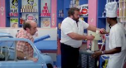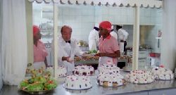 So, sehen wir uns mal den süßen Kram an. Ja. Ah, sieht ja widerlich aus. Gateau Chateau, Creme Surprese, hochtrabende Namen, womit man sich nur den Magen verdirbt und einem die Zähne ausfallen. Ich kenn' das aus Erfahrung. Hauptsache oben ist Sahne drauf!