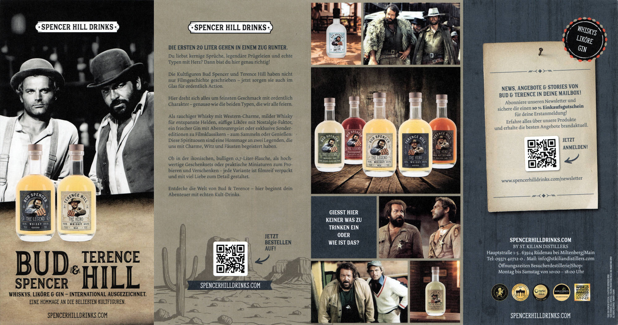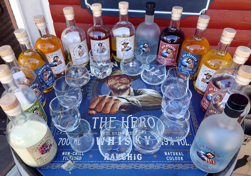 Im Jahr 2020 begann die Partnerschaft der deutschen Whisky-Brennerei St. Kilian zunächst mit Plattfuß-Vertriebs-GmbH, die die Markenrechte von Bud Spencer verwaltet. Der erste Whisky unter der Marke "Bud Spencer - The Legend" war ein milder Single-Malt-Whisky und wurde direkt ein voller Erfolg, so dass schon bald rauchige Variante des Whiskys und ein Chili-Zimt-Likör mit dem schlagkräftigen Namen "Feuerwasser" folgten. Und da Bud Spencer alleine zwar schon toll, aber erst im Gespann mit Terence Hill so richtig komplett ist, kamen knapp ein Jahr später unter dem Namen "Terence Hill - The Hero" auch Whiskys zu Ehren seines Kompagnons in den Handel. Und auch hier folgte mit "Voll auf Nuss" auch bald ein erster Likör.